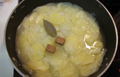 2. じゃがいもに火が通ったら、水(じゃがいもが浸るくらい)、コンソメ、塩、砂糖、ローリエを入れ、煮る(中火弱)。 |